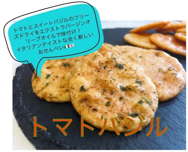 トマトとスイートバジルのフリーズドライをエクストラバージンオリーブオイルで味付けした、まるでピザのようなパリッとした食感のイタリアンテイストなおせんべいです!